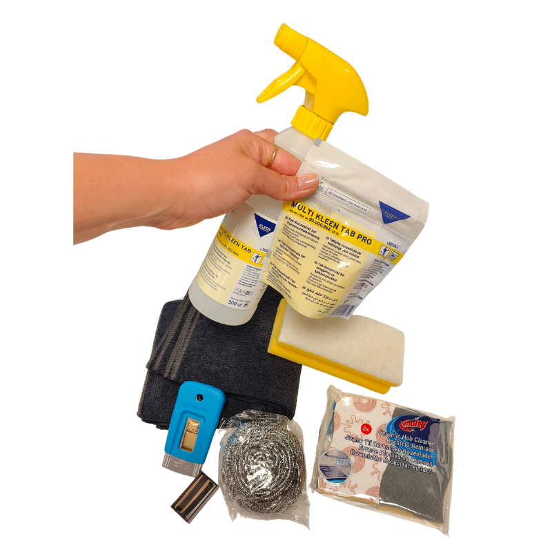De sorte mikrofiberklude har 295 GSM, hvilket betyder at de suger rigtig godt. Den rustfri stålsvamp og hvide skuresvamp med greb klarer selv de mest genstridige madrester. Med klikskraberen og bløde keramiske svampe får du skånsom, men grundig rengøring af glaskeramiske flader. Og med Purina Multi-Kleen tabs og medfølgende sprayflaske får du 30 flasker fedtopløsende rengøringsmiddel, til korrekt dosering - helt uden spild.