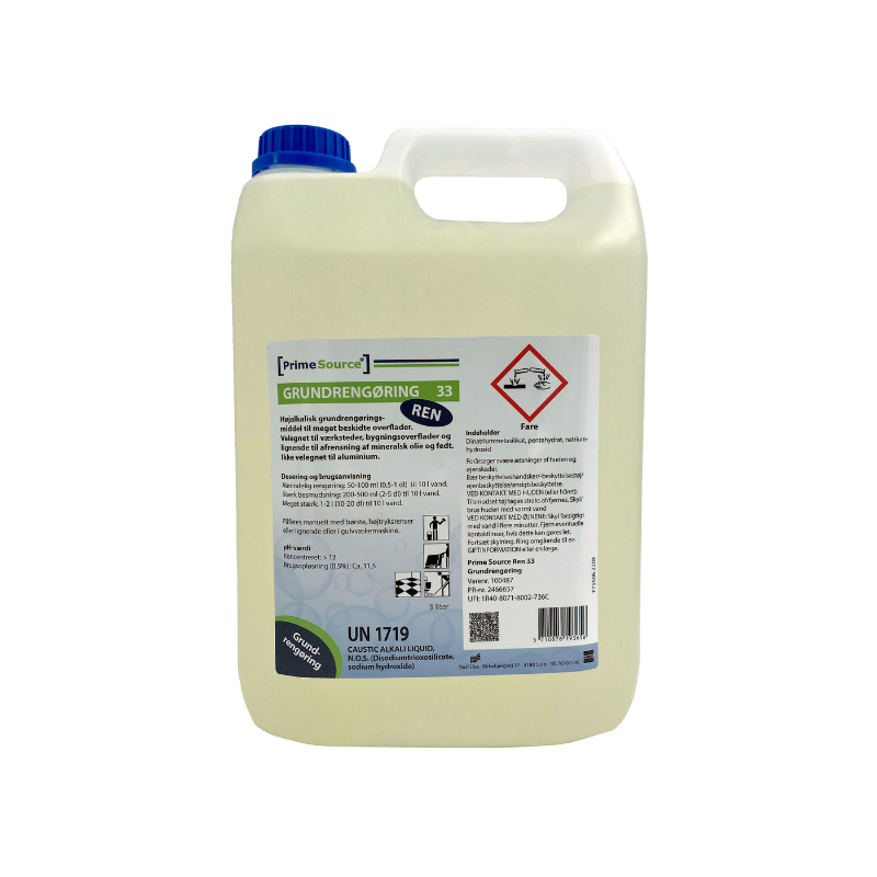 Prime Source Ren 33 er et kraftigt, højalkalisk grundrengøringsmiddel udviklet til rengøring af meget beskidte overflader. Produktet er særligt velegnet til miljøer, hvor der forekommer fedt, mineralsk olie og fastsiddende snavs, og hvor der ønskes et parfumefrit rengøringsmiddel.
