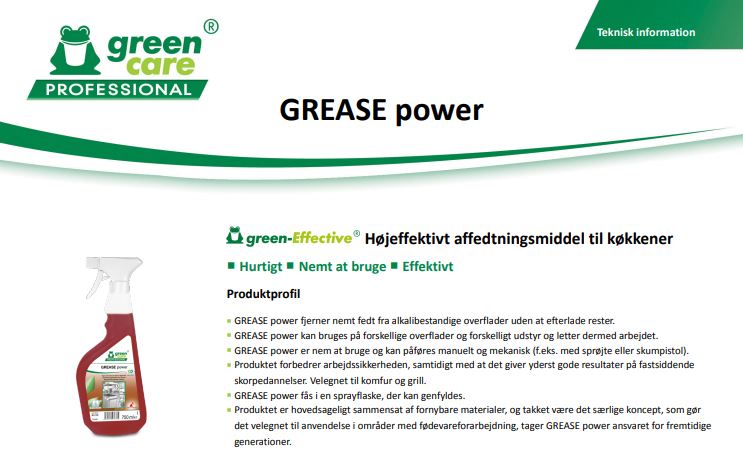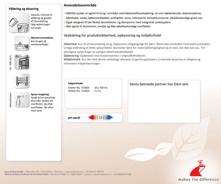 GREASE power fra Tana Green Care er en kraftig ovn- og grillrens uden parfume, udviklet til grundig rengøring af fedtbelastede og fastbrændte overflader. Produktet er klar til brug og velegnet til både erhverv og private. (Husk at bruge handsker og passe på dit gulv)